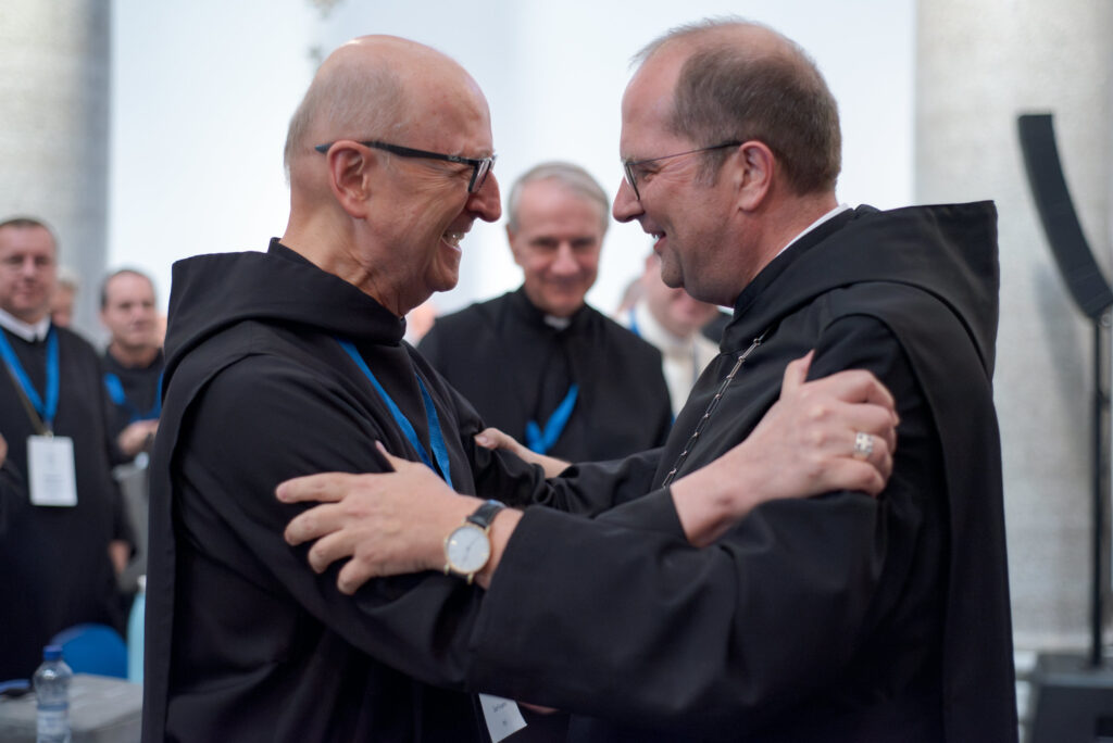 Abbot Primate Gregory Polan congratulates the newly elected Abbot Primate Jeremias Schrӧder.